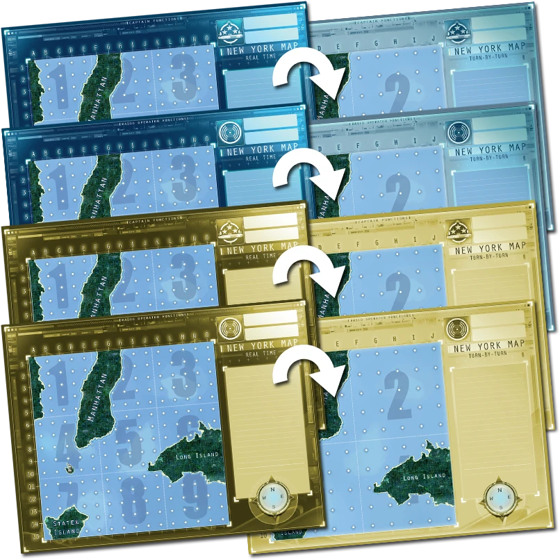 This promo set of maps for Captain Sonar was originally given out at the Asmodee booth at Gen Con 2016. It includes four two sided maps: two Captain Functions and two Radio Operator Functions. The map is of the Rivers between Manhattan, Long Island and Staten Island.