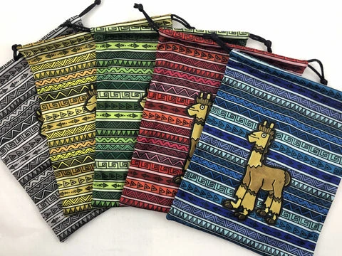 A set of five, microfiber drawstring bags for use with the game Altiplano. Each bag measures 17x20cm and is used as drawbags to replace the black fabric ones found in the box. Each bag features the llama from the cover of the Altiplano game box and is tinted to each player color.