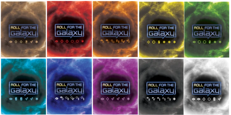 A set of ten 9x10cm drawstring bags designed to hold all of the dice from Roll For the Galaxy. These bags feature the game’s logo and a diagram of each die’s six sides for easy reference. The bags include all of the colors found in the Rivalry and Ambition expansions, but are small enough to fit in the original box.