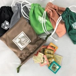 A set of eight drawstring bags featuring original artwork from the game Terra Mystica, used to store the cardboard tokens used in the game: