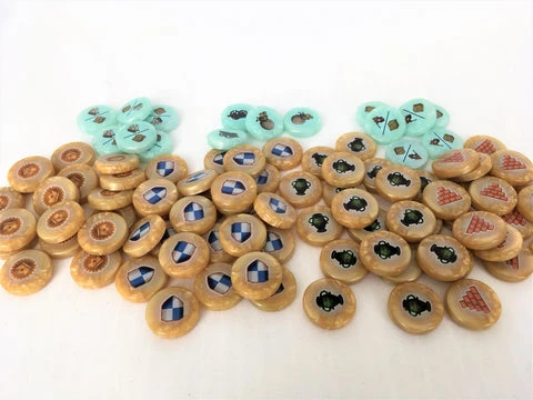 Please note --> while it is possible to use this set with the original edition of Endeavor published in 2009, these GeekUp bits feature the same image on BOTH sides, while the 2009 trade tokens have the “Glory” backs so you can also use them for victory points. If you wanted to use the GeekUp bits with the original version, we recommend printing out a scoring pad from the “Files” section of the 2009 edition so you don’t need the chips as victory token markers)