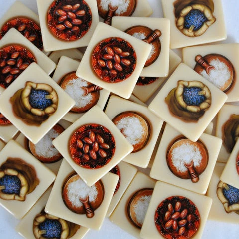 The goods tokens are made of a hard plastic, similar to Bakelite, and the graphics are applied via a 4 color heat transfer process, which fuses the images to the plastic in a way that makes them very scratch resistant, meaning they should last a lifetime.