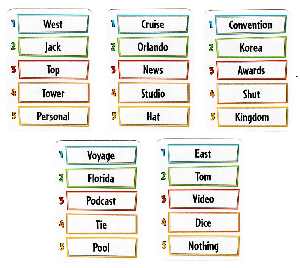 A pack of 5 new words for Just One, chosen by Dice Tower fans!