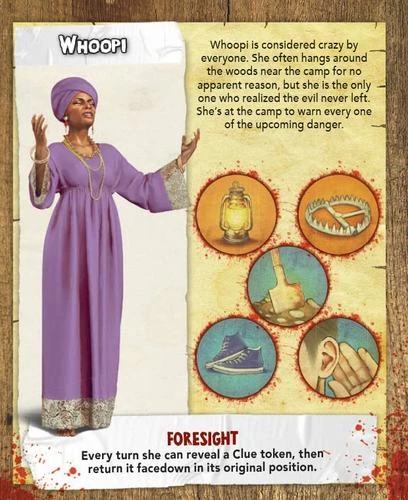 Whoopi is a promo character for The Last Friday. At the begining of a chapter, players may decide to play Whoopi instead of a camper. Whoopi comes with a set of special rules indicated on the card.