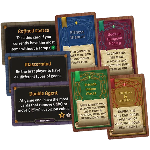 It features three new goal cards (instant, leader, and end game) and four new tome cards. Simply add these to your existing game to introduce new challenges and strategies.
