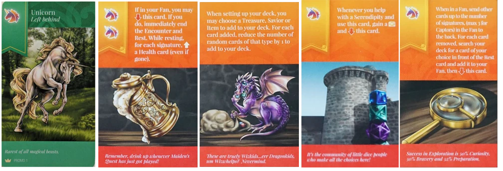 This listing is for a set of five promo cards for Maiden’s Quest, published by WizKids.
