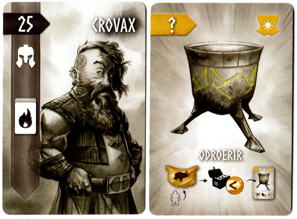 Odroerir: the Mythic Cauldron – During setup, put Odoerir aside. Shuffle the Age 2 Camp cards, the put Odrerir on the top of the deck. Therefore at the beginning of Age 2, Odroerir will be amongst the 5 available Camp cards. As soon as an Elvaland takes a card from the camp, put the smaller coin available from the Royal Treasure on Odroerir. Do this until an Elvaland takes the Odroerir card with the coins on it. The Odroerir card (with its coins) goes in the Command Zone. At the end of the game, Odroerir adds the sum of all of the coins on it to your Final Bravery Value.