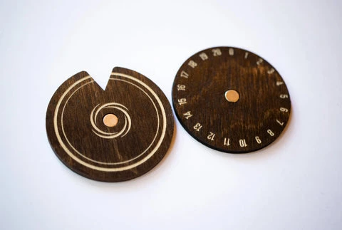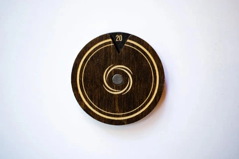 An elegant magnetic dial that goes from 0-20. Great for keeping up with hit points, life, rounds in a game, and much more. Made out of 2 – 1/8 inch birchwood, sanded and stained with the finest care, and connected with magnets to hold them together.