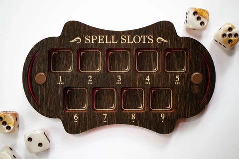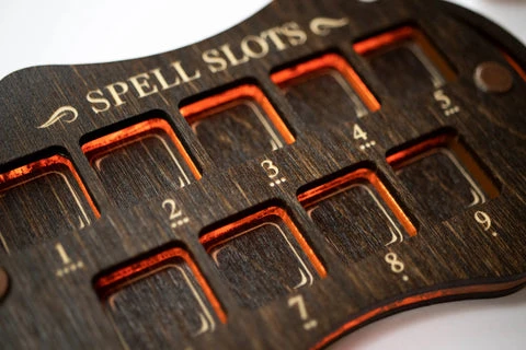 Are you looking to add some flare to your game table? Easily keep track of your spells with 6 sided dice in each section. Each section has its spell level and dots representing the maximum spell slots.