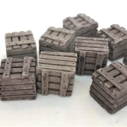 A set of 10 resin-made weathered looking crates measuring 13mm x 12mm x 10mm. Use them in any game you please to enhance your bits or for prototyping the next big title!