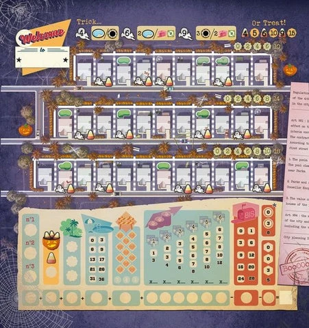 In this spooky neighborhood when players build houses they get to choose a trick or a treat, circling either a ghost or a candy. The first player to reach a certain amount of ghosts or candies can declare it to use the bonus. Once used, it’s no longer available to other players; who will then cross the bonus off. Only 1 ghost and 1 candy bonus per player!
