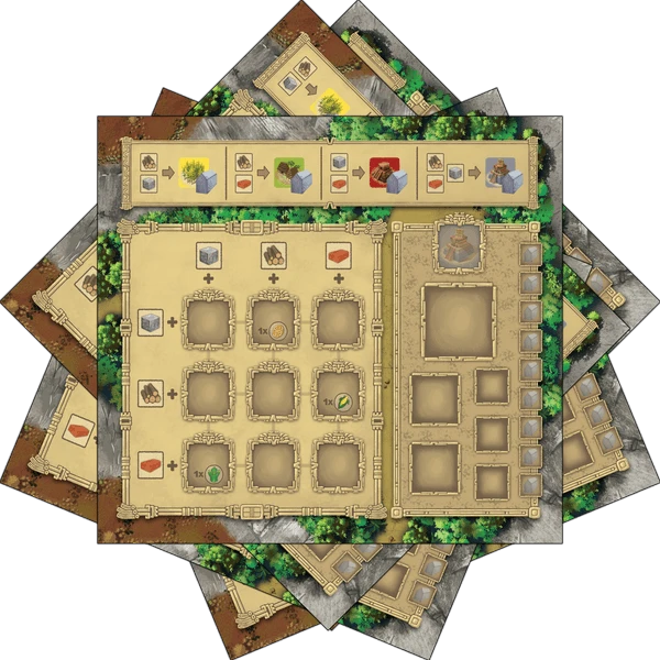 This promo pack is exclusive to the BGG Store and contains 5 asymmetrical player boards for Zapotec. By alternating the placement of the advanced one-time resources on the player board, as well as the positions of the basic resource rows and columns, each player has a unique board, allowing a little bit more customization of resources to obtain as part of the crucial first turn of the game.